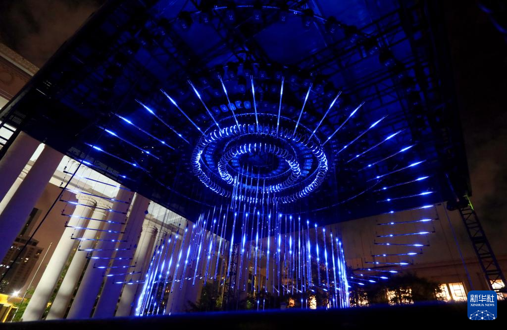 9月18日,工作人员安装调试灯光装饰艺术作品。