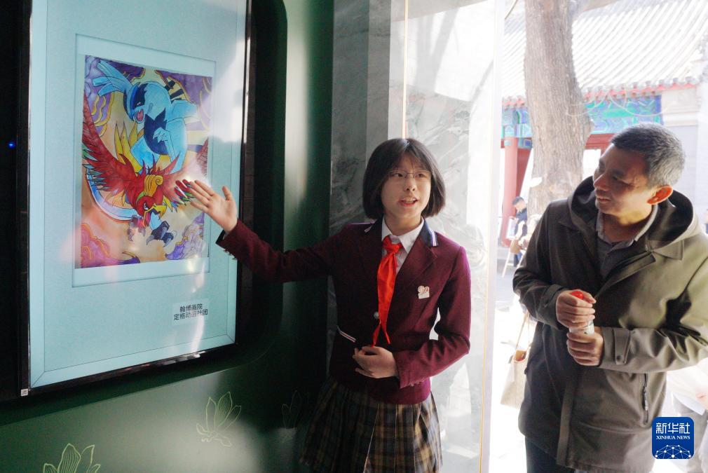 3月24日,府学胡同小学学生向来宾介绍学生创作的作品。
