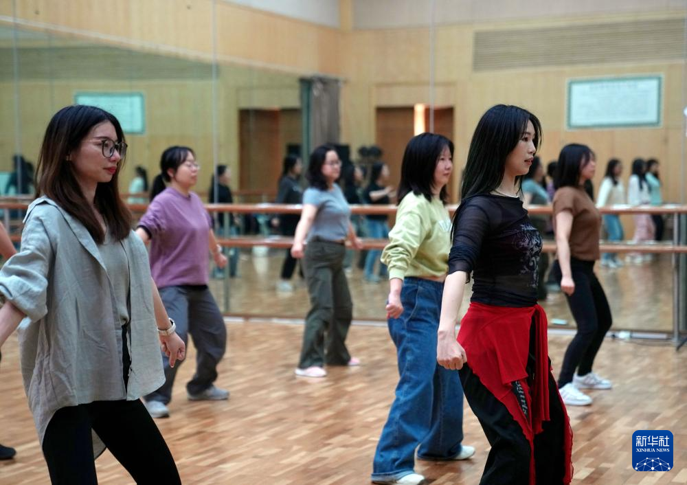 4月7日晚,在上海市群众艺术馆,爵士舞课程的学员们在上课。