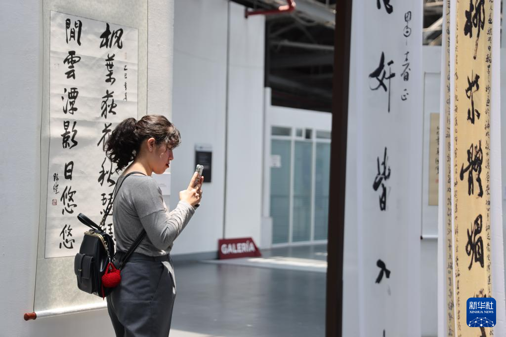 5月3日,人们在墨西哥首都墨西哥城举办的“兰亭·雅集”中国书法展上欣赏书法作品。