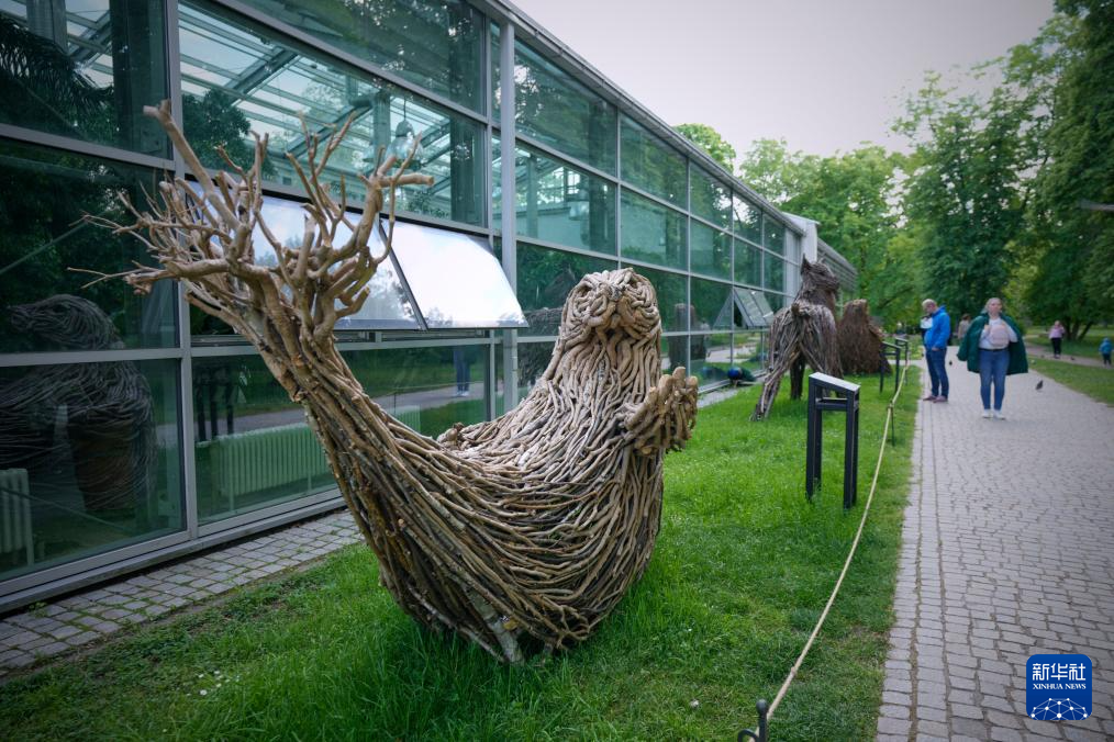 这是5月6日在波兰首都华沙拍摄的猞猁树枝雕塑。