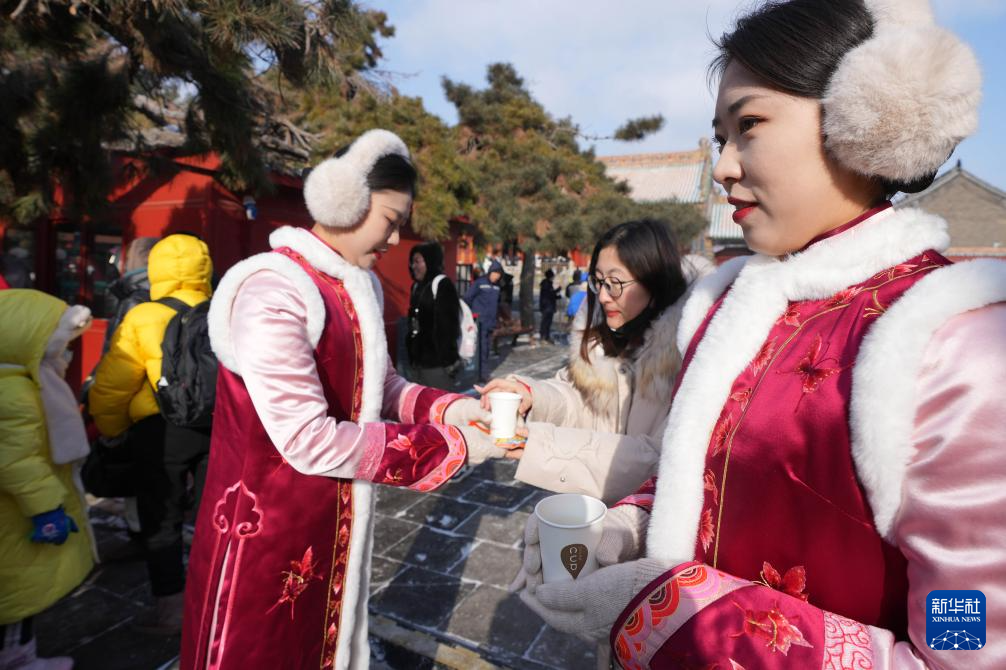 2024年1月21日,沈阳故宫工作人员为游客提供姜糖水和暖贴。