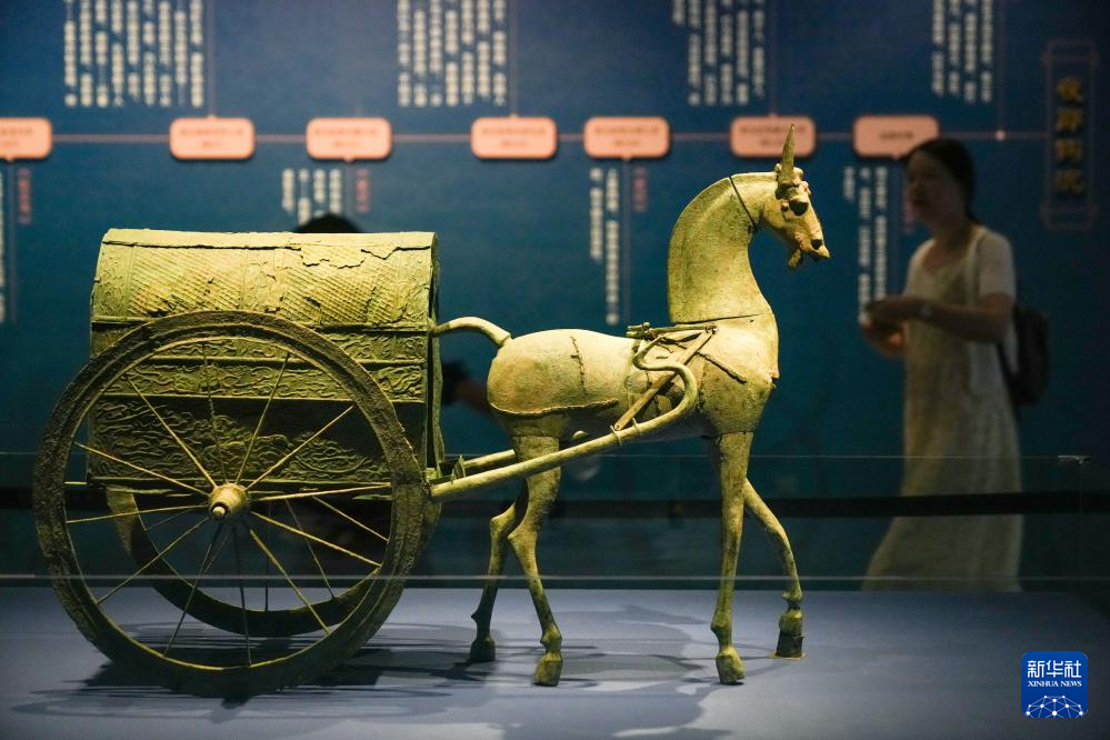 这是5月22日在长沙博物馆“夜郎遗踪——寻找《史记》中的古国”特展上拍摄的展品铜车马(辎车)(复制件)。