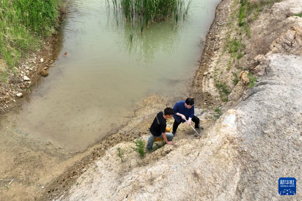 6月28日,张志忠(右)带着学生在寻找烧制瓷器的原料(无人机照片)。