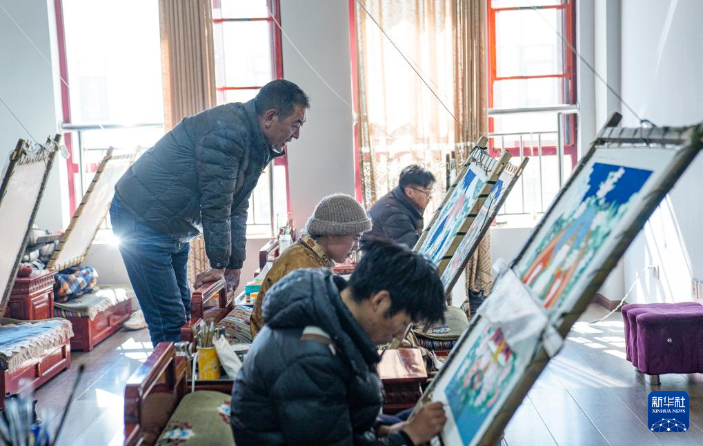2月10日,罗布斯达在西藏唐卡画院的教室里指导学徒画唐卡。