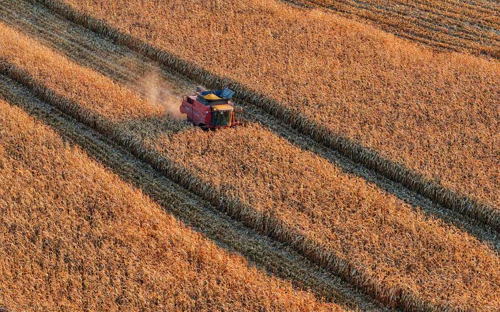 2025年10月14日在黑龙江省同江市街津口赫哲族乡,农户在收获玉米(无人机照片)。新华社发(刘万平摄)