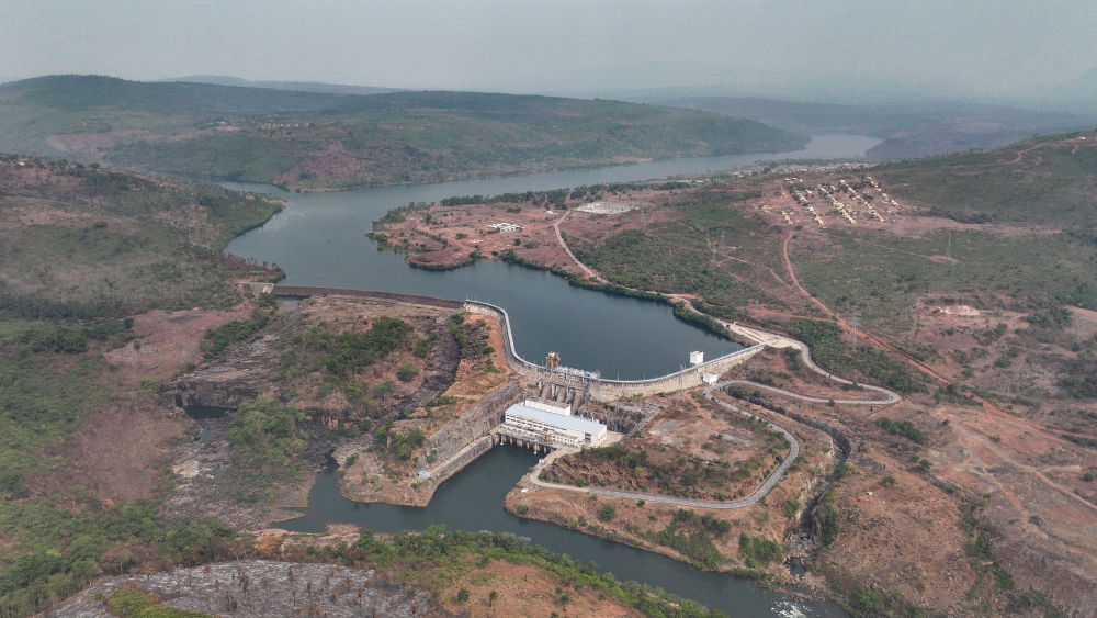 这是2025年4月24日在几内亚杜布雷卡省拍摄的凯乐塔水电站(无人机照片)。