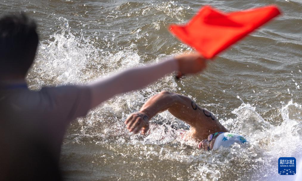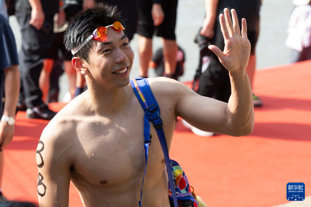 7月16日,参加男子抢渡赛的选手闫子贝登岸后向观众挥手致意。新华社记者 肖艺九 摄