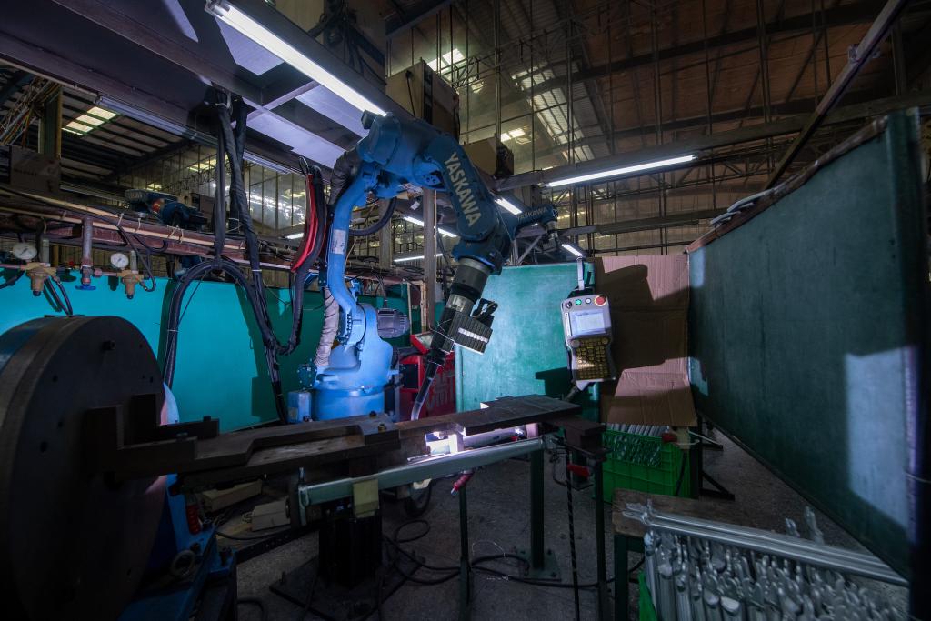 在深圳市喜德盛自行车股份有限公司生产线,机械臂正在焊接车架。新华社记者 毛思倩 摄