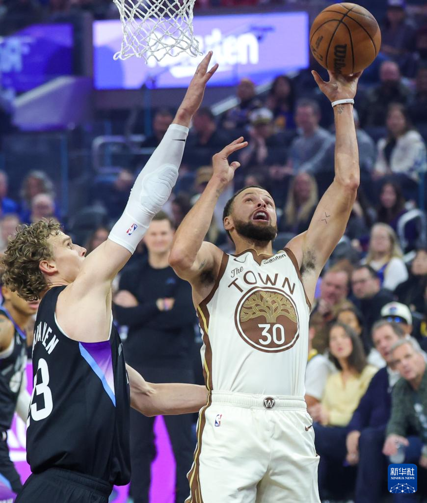 11月24日,勇士队球员库里(右)在比赛中上篮。