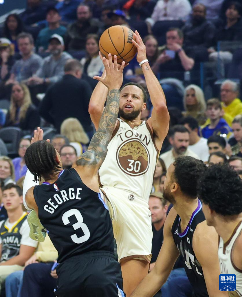 11月24日,勇士队球员库里(上)在比赛中投篮。