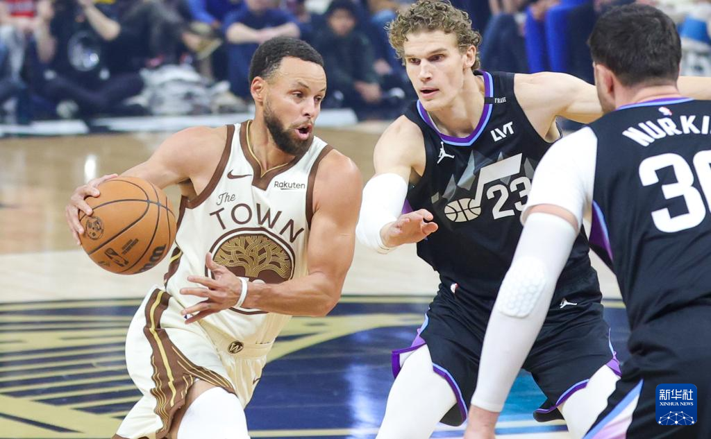 11月24日,爵士队球员李凯尔(中)与勇士队球员库里(右)在比赛中拼抢。
