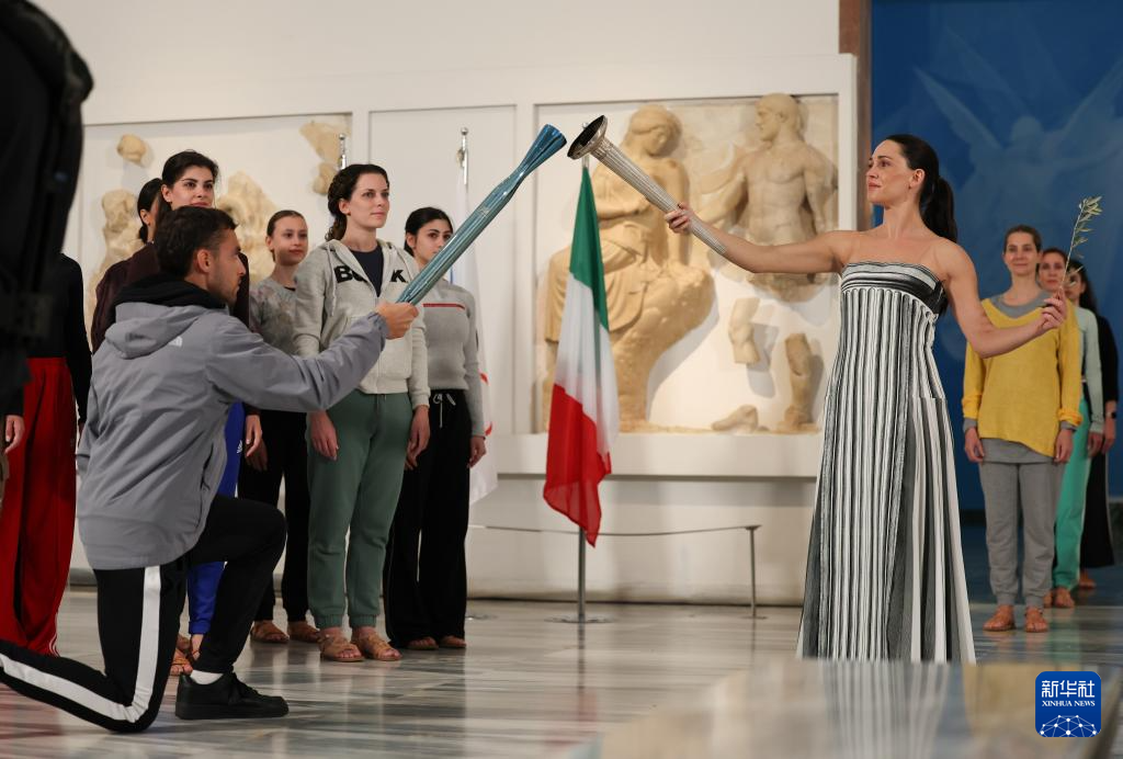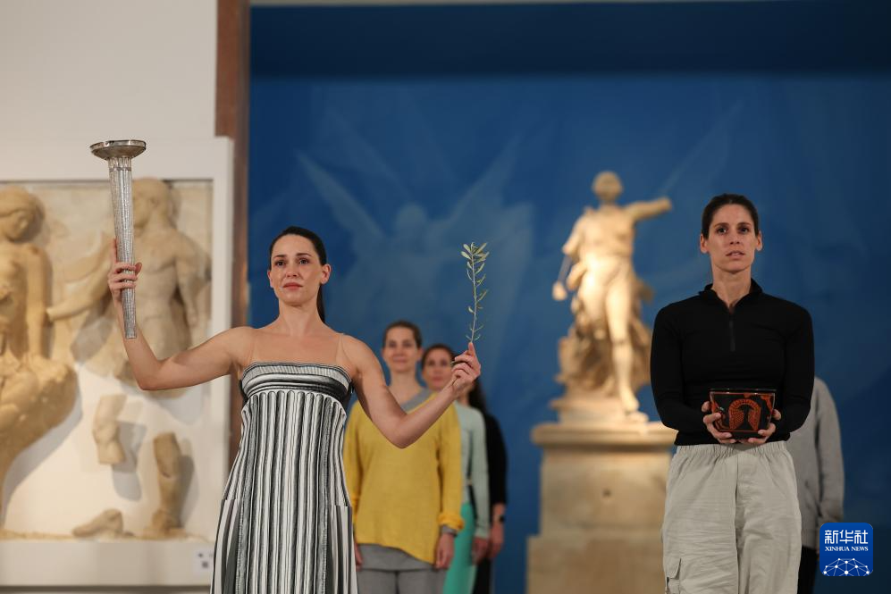 11月25日,扮演最高女祭司的演员玛丽·米娜(右)与第一棒火炬手、希腊运动员彼得罗斯在彩排中。