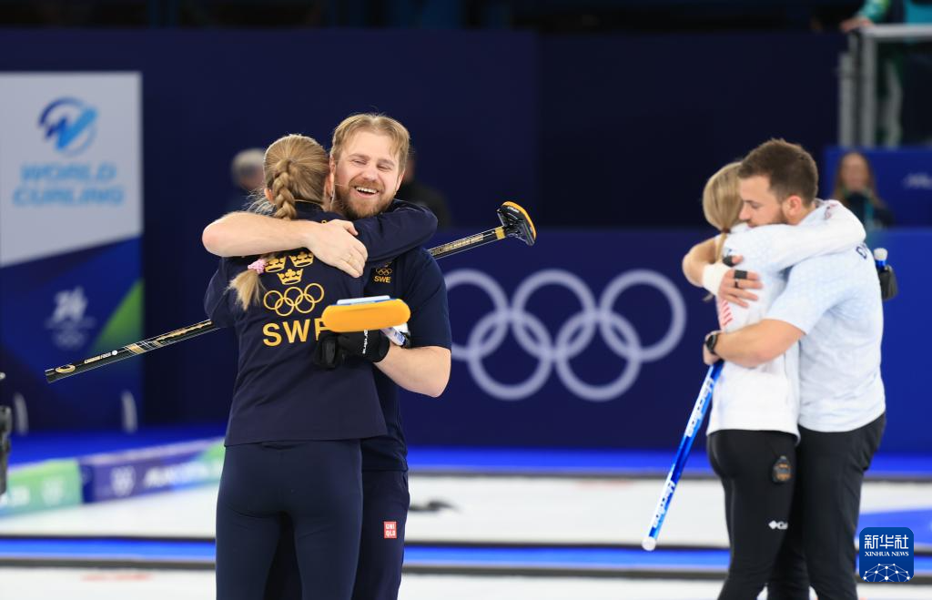 当地时间2月10日,在米兰-科尔蒂纳冬奥会冰壶混合双人金牌赛中,瑞典队6比5战胜美国队,获得冠军。