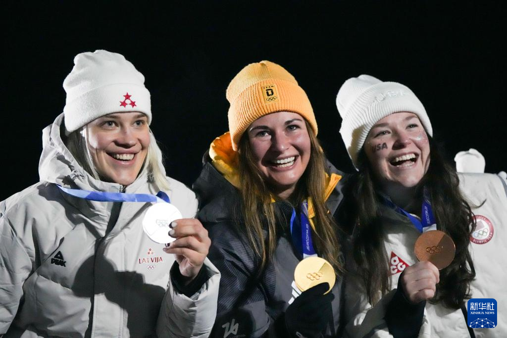2月10日,冠军德国选手陶比茨(中),亚军拉脱维亚选手博塔(左),季军美国选手阿什莉·法夸尔森在颁奖仪式上合影。
