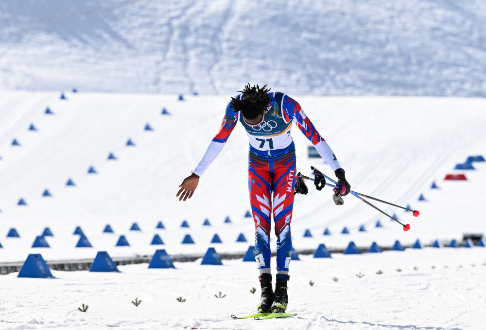 2月8日,海地选手萨瓦尔在越野滑雪男子双追逐(10公里传统技术+10公里自由技术)比赛后向观众致意。新华社记者 贺灿铃 摄