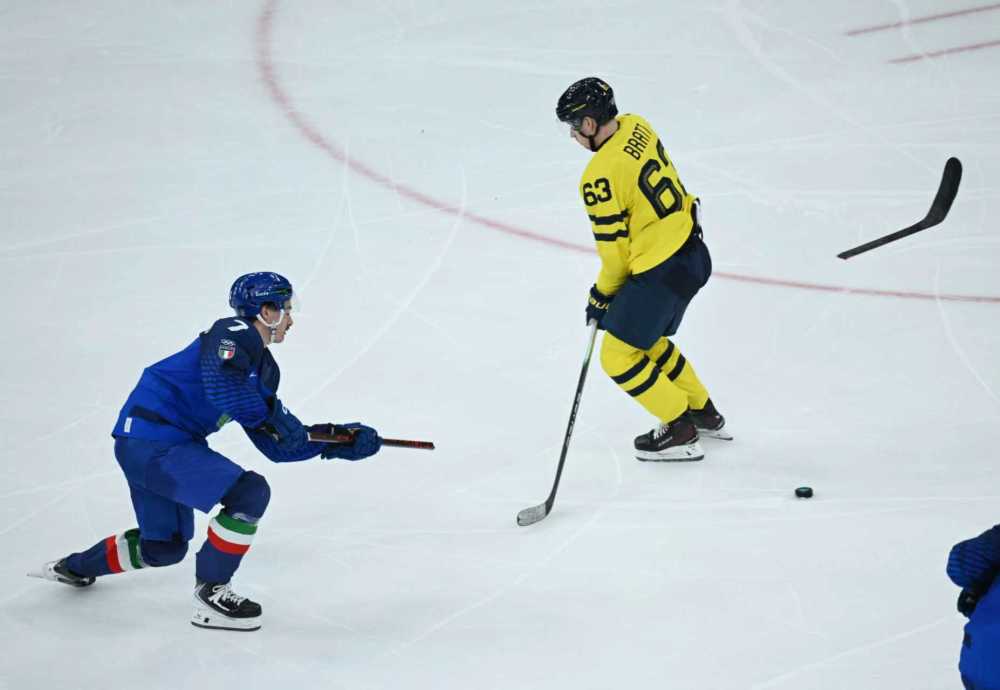 2月11日,瑞典队选手耶斯佩尔·布拉特(右)与意大利队选手亚历山德罗·塞加弗雷多在冰球项目男子小组赛中拼抢。新华社记者 张豪夫 摄