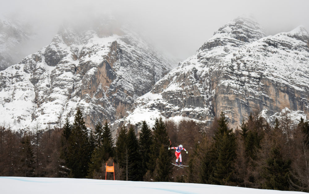 2月10日,瑞士选手贾丝明·弗卢里在高山滑雪女子团体全能滑降比赛中。新华社记者 费茂华 摄
