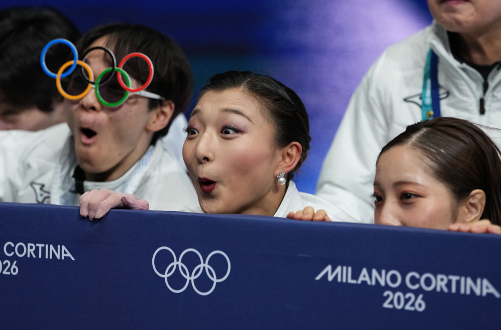 2月8日,日本队选手坂本花织(中)在花样滑冰项目团体赛后等待成绩。新华社记者 薛宇舸 摄
