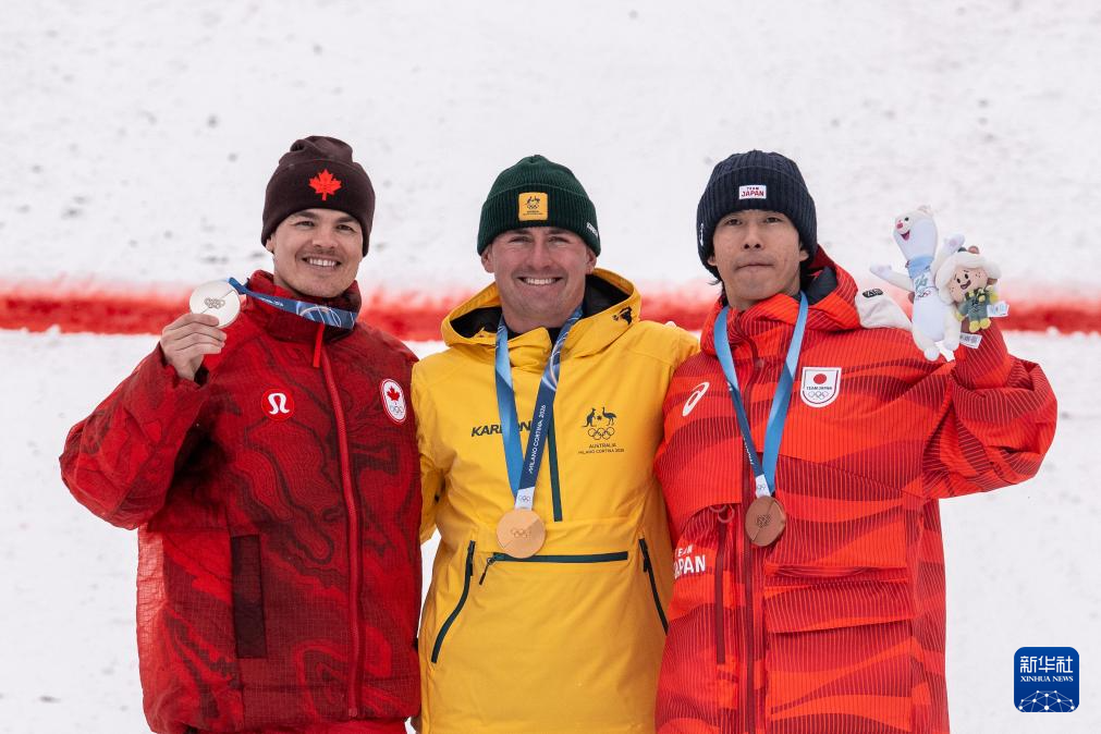2月12日,冠军澳大利亚选手库珀·伍兹(中)、亚军加拿大选手米凯尔·金斯伯里(左)和季军日本选手堀岛行真在颁奖仪式上。