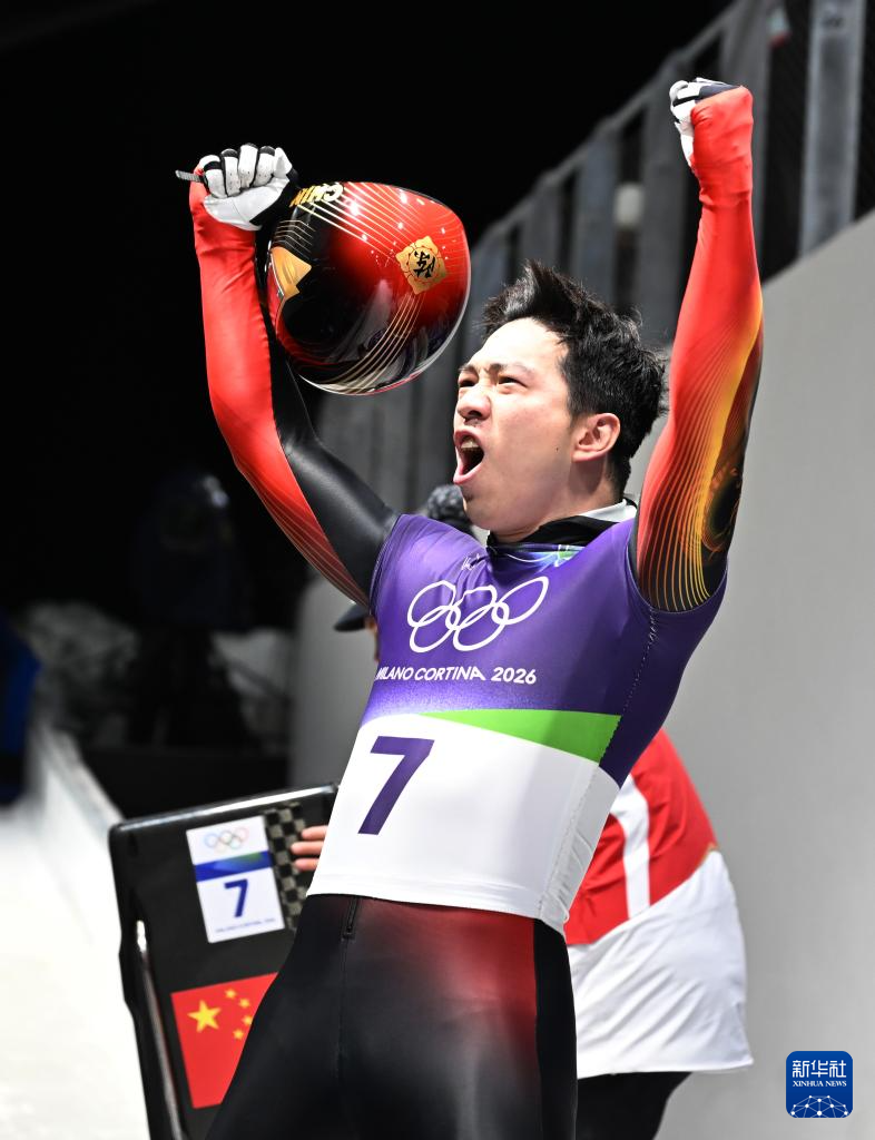2月13日,中国选手陈文浩(前)在第四轮比赛后与队友拥抱庆祝。他获得第四名。