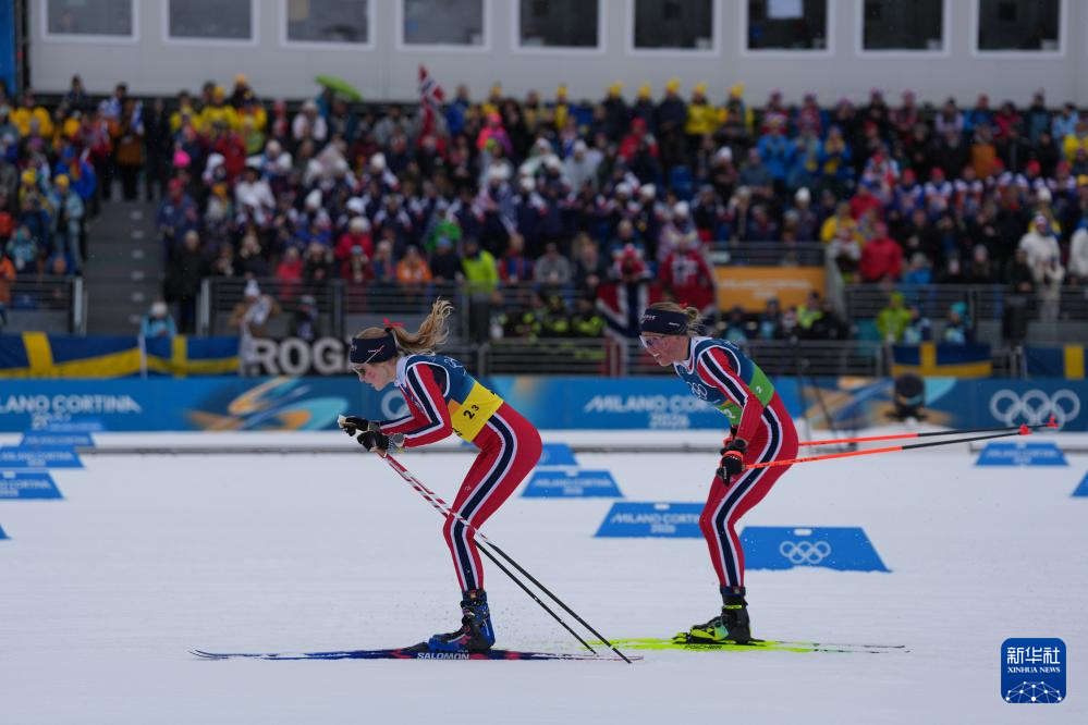 2月14日,挪威队选手海迪·文格(右)在冲线后与队友庆祝。挪威队获得冠军。