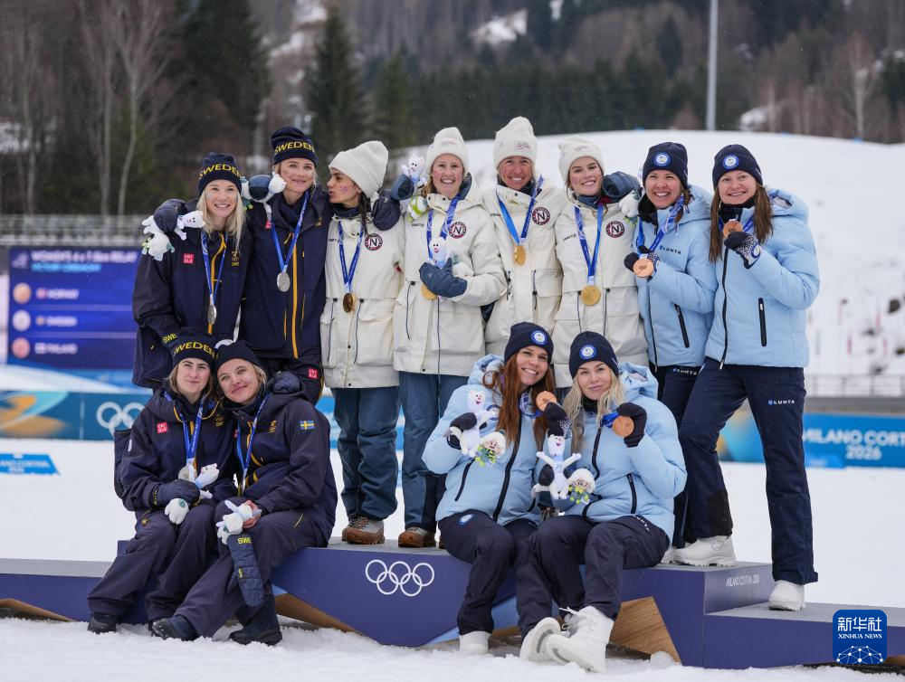 2月14日,冠军挪威队(中)、亚军瑞典队(左)和季军芬兰队(右)在颁奖仪式上合影。