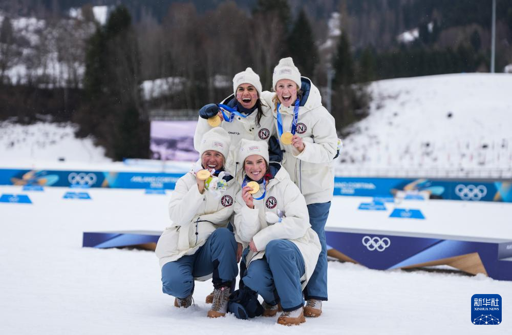 2月14日,获得冠军的挪威队选手克里斯廷·奥斯特古伦·福斯内斯(前右)、阿斯特丽德·厄伊勒·斯林德(前左)、卡罗琳·辛普森-拉尔森(后右)和海迪·文格在颁奖仪式上合影。