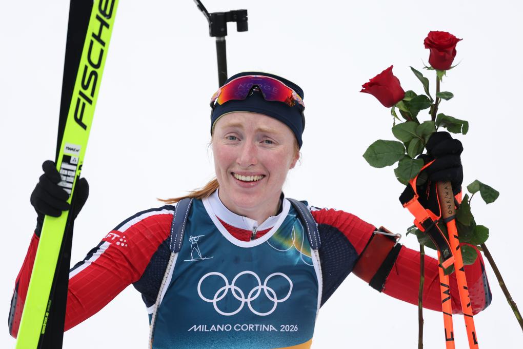 冬季两项女子7.5公里短距离比赛中,冲刺、撞线后,每位运动员领到一朵红玫瑰。