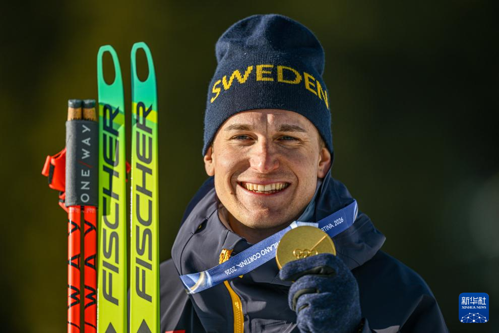 2月15日,冠军瑞典选手蓬西卢奥马在颁奖仪式上庆祝。