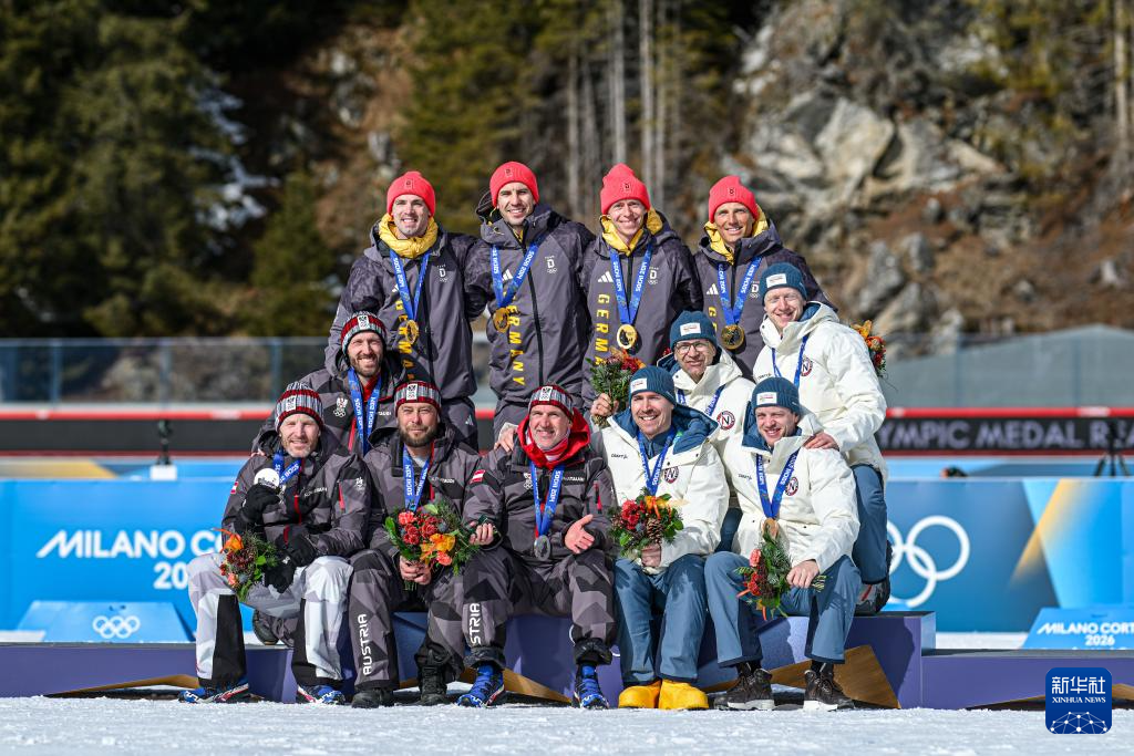 2月15日,2014年索契冬奥会冬季两项男子4×7.5公里接力比赛冠军德国队(后)、亚军奥地利队(前左)、季军挪威队在奖牌重新颁发仪式上合影。