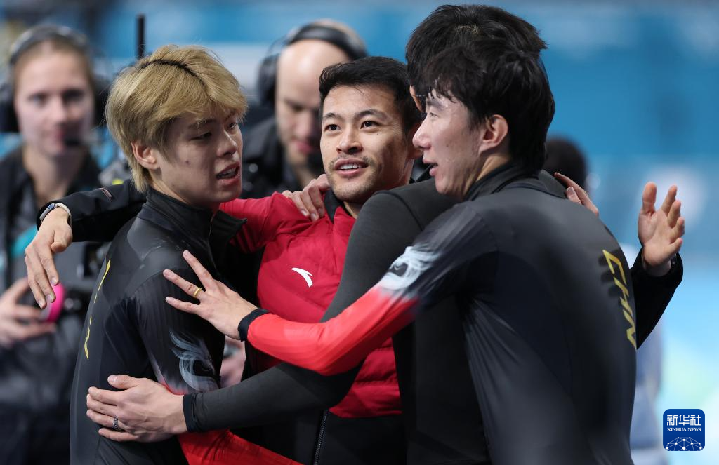 2月15日,中国队选手刘瀚彬、宁忠岩、李文淏、吴宇(从左至右)在赛后庆祝。