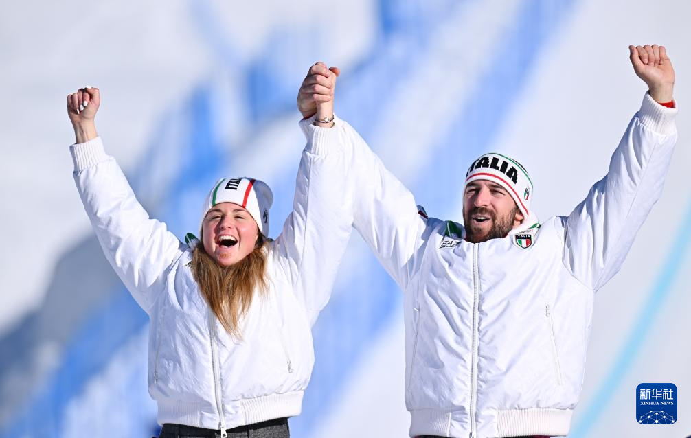 2月15日,冠军英国1队组合休·奈廷格尔(中上)/夏洛特·班克斯(中下),亚军意大利1队组合洛伦佐·索马里瓦(左上)/米凯拉·莫约利(左下)、季军法国2队组合洛昂·博佐洛(右上)/莱娅·卡斯塔在颁奖仪式上合影。