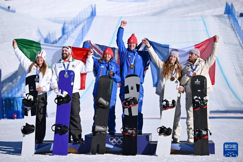 2月15日,冠军英国1队组合休·奈廷格尔(右三)/夏洛特·班克斯(左三),亚军意大利1队组合洛伦佐·索马里瓦(左二)/米凯拉·莫约利(左一),季军法国2队组合洛昂·博佐洛(右一)/莱娅·卡斯塔在颁奖仪式上。