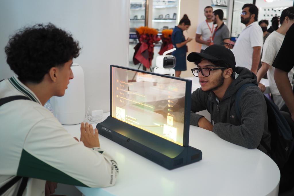 10月14日,两名外籍客商在义乌全球数贸中心体验AI翻译互动屏。新华社记者 刘梓漪 摄