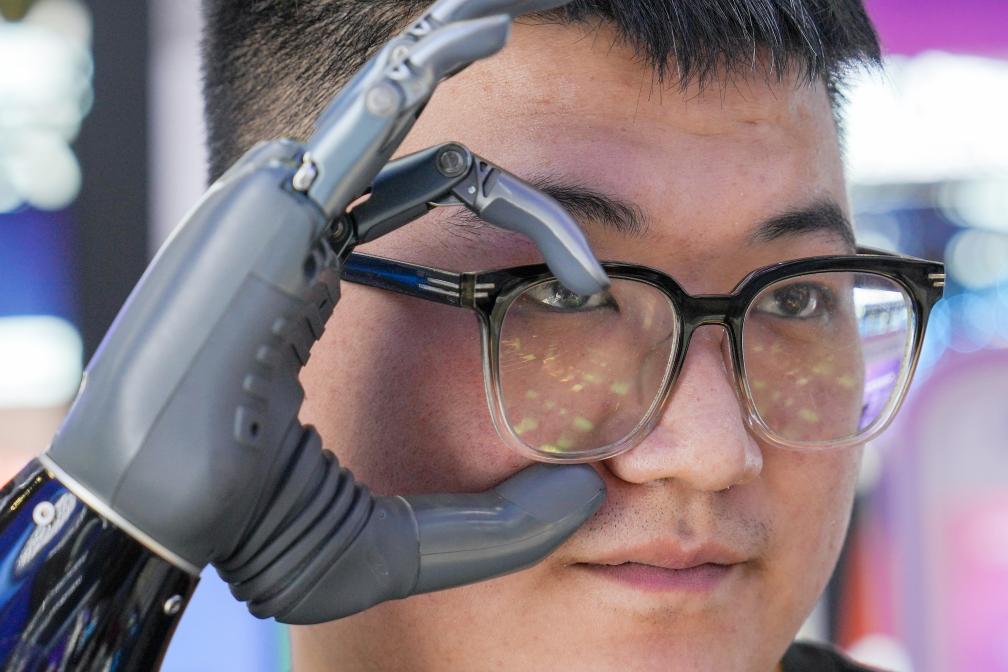 2025年7月17日,在北京举行的第三届中国国际供应链促进博览会上,浙江强脑科技有限公司一名右手残疾的工作人员在佩戴了BrainCo智能仿生手后摘取眼镜。新华社记者 鞠焕宗 摄