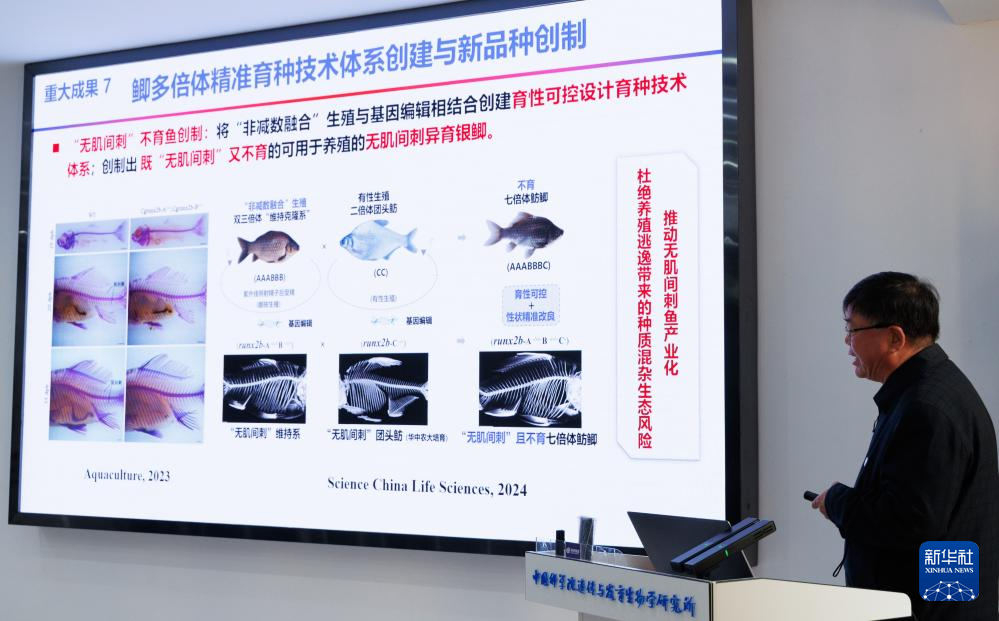 12月22日,在中国科学院遗传与发育生物学研究所举行的发布会上,中国科学院院士、中国科学院水生生物研究所研究员桂建芳在介绍研究成果。新华社记者 金立旺 摄