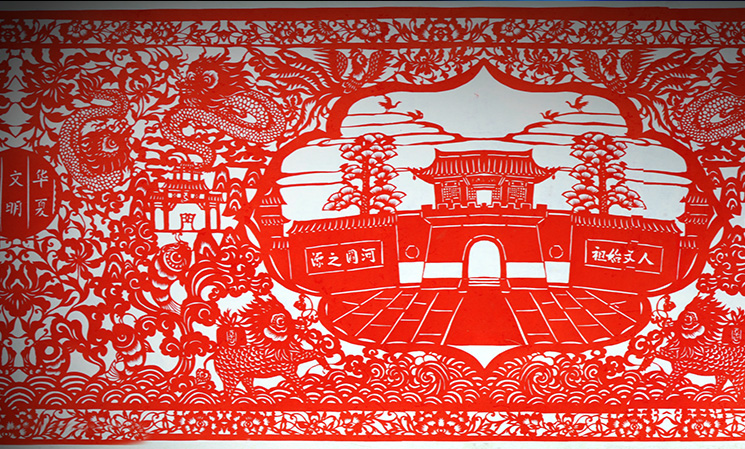 于是我決定回家專(zhuān)門(mén)剪紙,但是我父母認(rèn)為鉸花都是老婆婆們閑著沒(méi)事做的事,你一個(gè)男孩子還是應(yīng)該好好賺錢(qián)。就這樣我跟父母僵持了很久,但最后還是我拗著性子從外邊回到了我們農(nóng)村老家,開(kāi)始尋找會(huì)剪紙的老人,去記錄、去詢(xún)問(wèn)、學(xué)習(xí)我們地區(qū)傳統(tǒng)的剪紙民俗知識(shí)。因?yàn)楝F(xiàn)在像剪紙這個(gè)藝術(shù),在我們的地區(qū)還僅是一些老人出自一些喜好去剪、去做,但隨著這些老人的去世,這些作品也就會(huì)隨著一把火被燒掉。我希望我能把這些東西都保留下來(lái),我希望有更多的人去了解我們地區(qū)的剪紙文化,所以我就下決心收集這些剪紙的資料,去申報(bào)非物質(zhì)文化遺產(chǎn)名錄。想要申報(bào)還要去做很多的事情,一是去尋找這些傳世的老作品,另外就是要擴(kuò)大孟津剪紙的影響力,參加各種比賽去獲獎(jiǎng)。那時(shí)我白天去尋找老藝人,晚上就自己在屋里埋頭創(chuàng)作,每天晚上都會(huì)剪到凌晨一點(diǎn)多。我媽本來(lái)是反對(duì)的,但是當(dāng)她看到每晚我都會(huì)剪到很晚,她就明白了我是真心喜歡這個(gè)事兒,就慢慢地開(kāi)始心疼我。后來(lái)她也幫助我開(kāi)始粘貼,像我剪的《都說(shuō)我孟津好風(fēng)光》,這個(gè)作品長(zhǎng)13米,沒(méi)有那么長(zhǎng)的紙,我們就一起粘貼。花了三個(gè)多月剪完,家里邊沒(méi)有那么大粘貼裝裱的空間,我父母就站在我們家院子的平房頂上一起把它鋪開(kāi),一個(gè)一個(gè)地粘起來(lái)裱好。