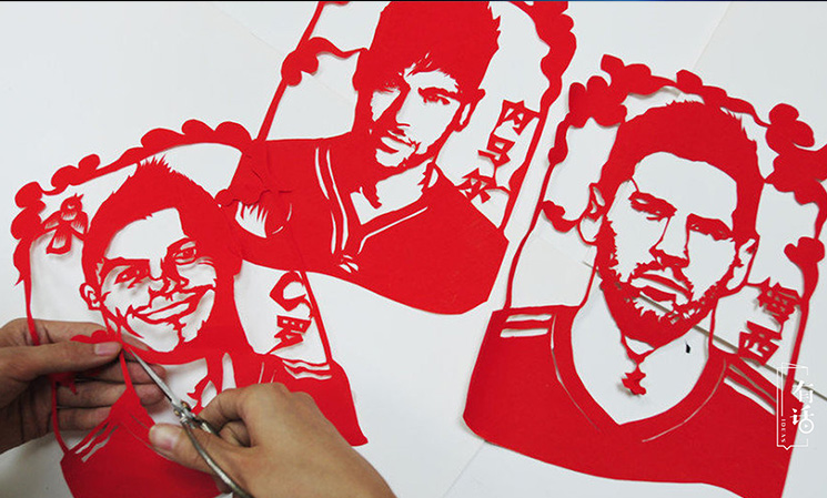 我之前剪過(guò)的民俗剪紙作品,像《白蛇傳》、《七月七鵲橋會(huì)》、《夜哭郎》等等,這些題材承載的是我們的傳統(tǒng)。但這些較為傳統(tǒng)的剪紙受眾并不多,所以我認(rèn)為青年人要有新的創(chuàng)新,加入現(xiàn)代社會(huì)中許多時(shí)尚前衛(wèi)的元素,這樣才能獲得更多人的喜愛(ài)。在2014年世界杯的時(shí)候,我就試著剪“世界杯剪紙”,梅西、C羅、內(nèi)馬爾,讓一些球星躍然紙上,讓熱愛(ài)足球的年輕人去關(guān)注、了解到傳統(tǒng)的剪紙藝術(shù)。2015年是世界反法西斯戰(zhàn)爭(zhēng)勝利70周年,我看到關(guān)于戰(zhàn)爭(zhēng)的一些資料圖片后,就創(chuàng)作了一幅《南京大屠殺》剪紙。畫(huà)面中運(yùn)用了黃色、紅色、黑色表現(xiàn)土地、火焰還有憤怒,這些都是用剪紙來(lái)表達(dá)我心中的感受。我的工作室現(xiàn)在也會(huì)做一些時(shí)尚的婚紗照剪紙,還有生日剪紙等,把這些傳統(tǒng)吉祥的寓意融入到現(xiàn)代人們的需求、裝飾和禮物中。