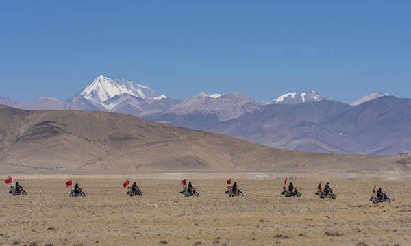 西藏日喀則市薩嘎縣昌果鄉(xiāng)的一處村莊里,48歲的藏族漢子石覺塔布在風(fēng)中跨上一輛摩托車,向平坦無垠的高原邊緣騎去。他的車尾插著一面五星紅旗,被風(fēng)吹得獵獵作響,即便駛出很遠(yuǎn),那抹紅色在車輪卷起的煙塵中也依然醒目。