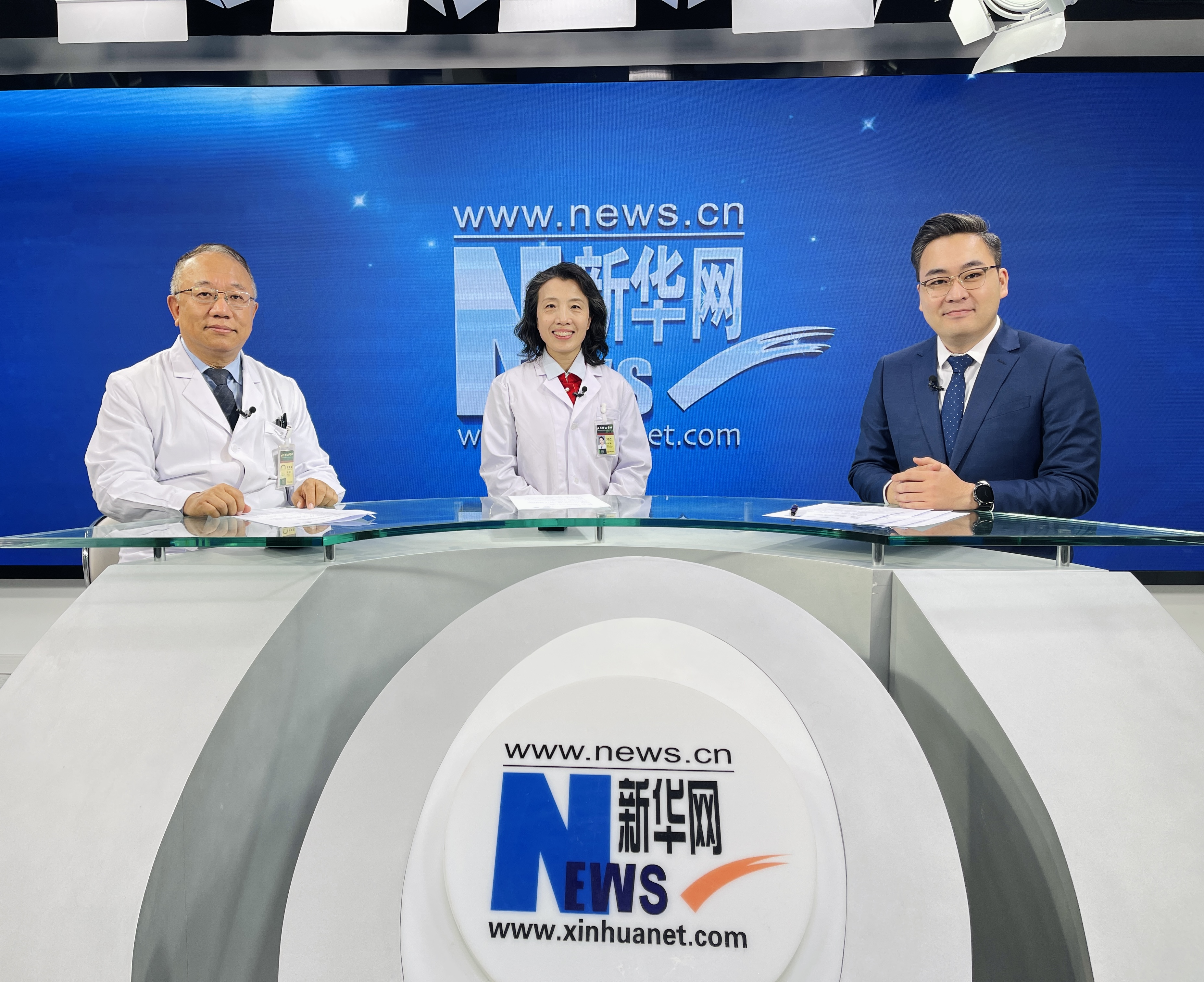 北京协和医院妇产科主任医师马良坤教授(中)、北京协和医院泌尿外科主任医师李宏军(左)教授做客新华网演播间