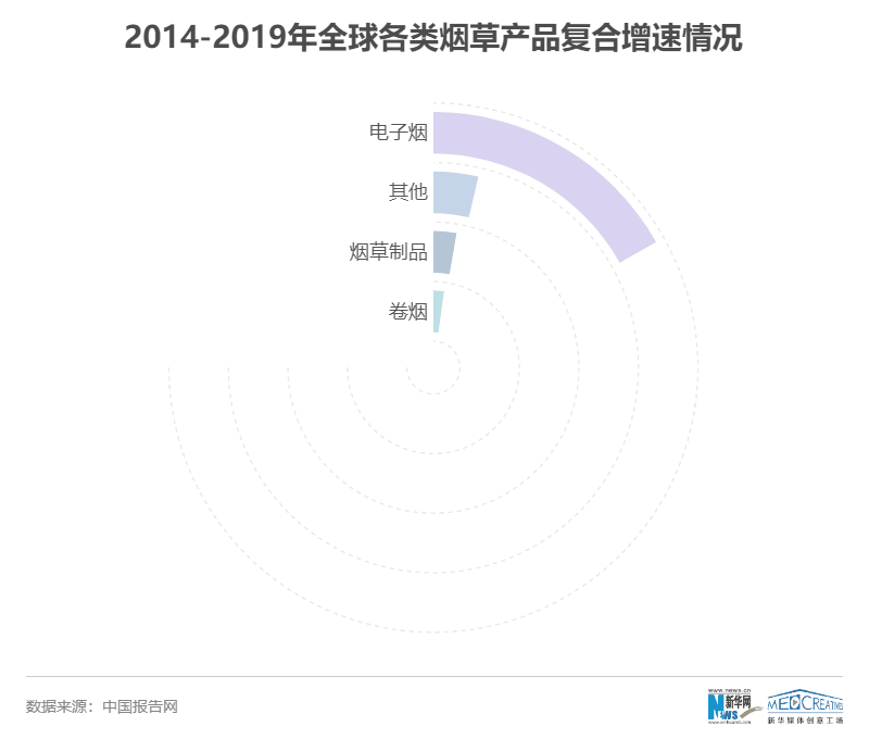 ????? 根據《2020年全球電子煙行業及細分市場規模、市場份額情況分析》報告顯示,電子煙行業增速遙遙領先卷煙和其他制品,其2014-2019年年復合增速達到24.2%,遠高于卷煙(3.2%)和其他制品(5.3%)增速。