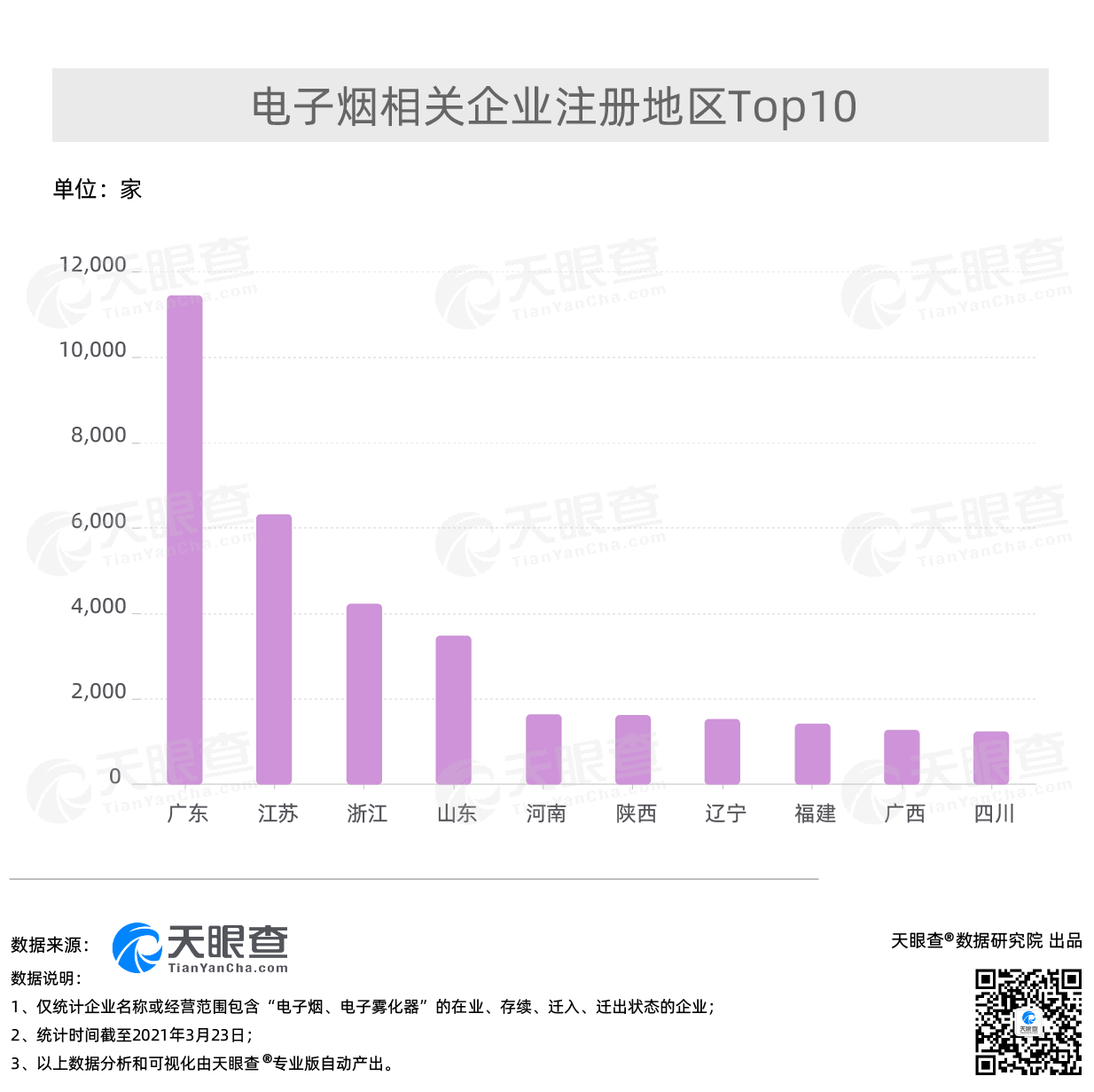 ????? 電子煙行業已經在全球范圍內顯露不可小覷的發展趨勢,在中國也總體呈現上升趨勢。天眼查專業版數據顯示,目前我國共有超4.7萬家企業名稱或經營范圍含“電子煙、電子霧化器”。從地域分布上看,廣東的電子煙相關企業數量最多,超1.1萬家。據界面新聞此前報道,全球90%的電子煙都出自深圳寶安區,這里已經成為全球最大的電子煙生產基地,被稱為“全球霧谷”。