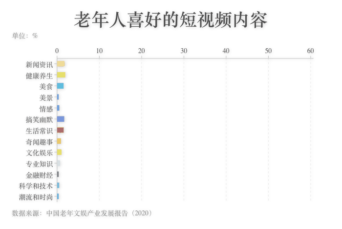 ????? 老年人群喜歡的短視頻內容具有明顯的年代特征和生活氣息。健康養生、新聞資訊、搞笑幽默的內容是很多老年群體首選觀看的短視頻內容;其次,關于生活常識和美食的內容也很受歡迎,歷經風霜的老年人群依舊喜好人間煙火味兒。