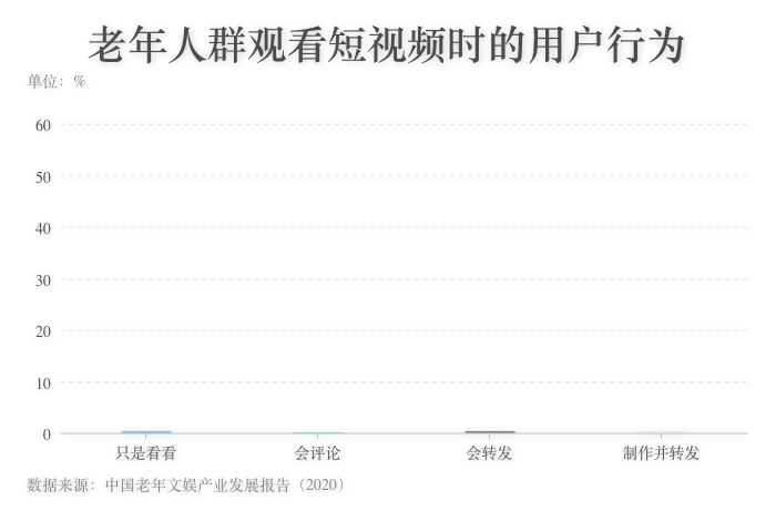 ???? ?總的來看,由于使用短視頻應用的熟練程度、觀看短視頻的習慣等一些因素的影響,老年人群觀看短視頻的互動較少,但較愛轉發。從所有年齡段的用戶互動來看,82.8%的用戶有過不同形式的短視頻互動。其中,63.8%的用戶會轉發分享,65.5%的用戶會點贊、評論、收藏,不參與互動的用戶僅占13.2%。參與轉發分享的短視頻用戶當中,20~39歲人群是主力軍,占比近60%,不參與互動的多為40歲以上的用戶。來自60加研究院的統計結果顯示,在參與互動的老年用戶中,會轉發的用戶占比達到53.8%,轉發是他們常有的互動行為。