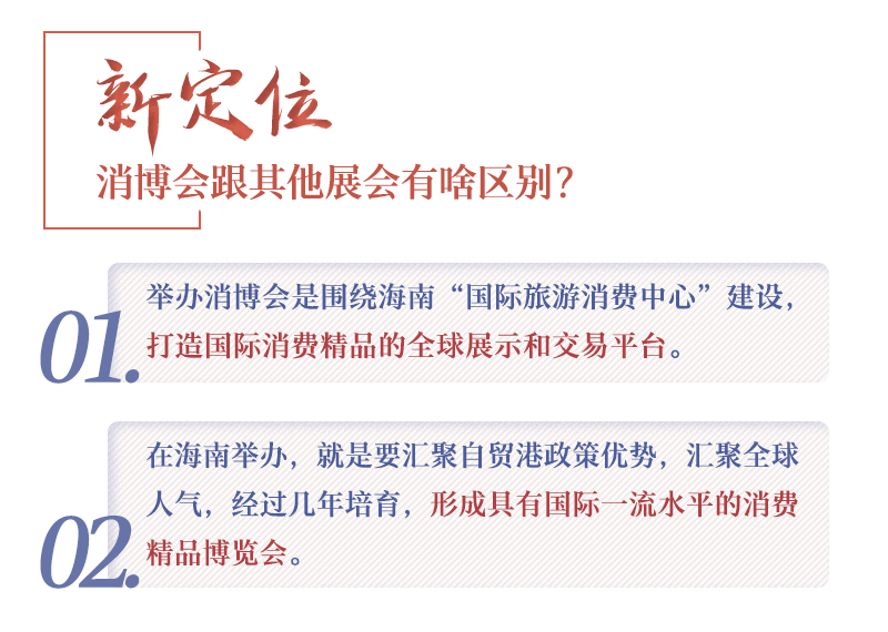 ??? 消博會(huì)的舉辦背后,是來自海南自貿(mào)港一系列政策紅利的支撐。早在2020年6月1日,由中共中央、國(guó)務(wù)院印發(fā)的《海南自由貿(mào)易港建設(shè)總體方案》中,就已經(jīng)明確了海南國(guó)際旅游消費(fèi)中心的定位,提出舉辦中國(guó)國(guó)際消費(fèi)品博覽會(huì)。而“培育國(guó)際消費(fèi)中心城市”和“辦好進(jìn)博會(huì)、廣交會(huì)、服貿(mào)會(huì)及首屆中國(guó)國(guó)際消費(fèi)品博覽會(huì)等重大展會(huì)”,更是被分別寫入“十四五”規(guī)劃綱要和今年的政府工作報(bào)告。
