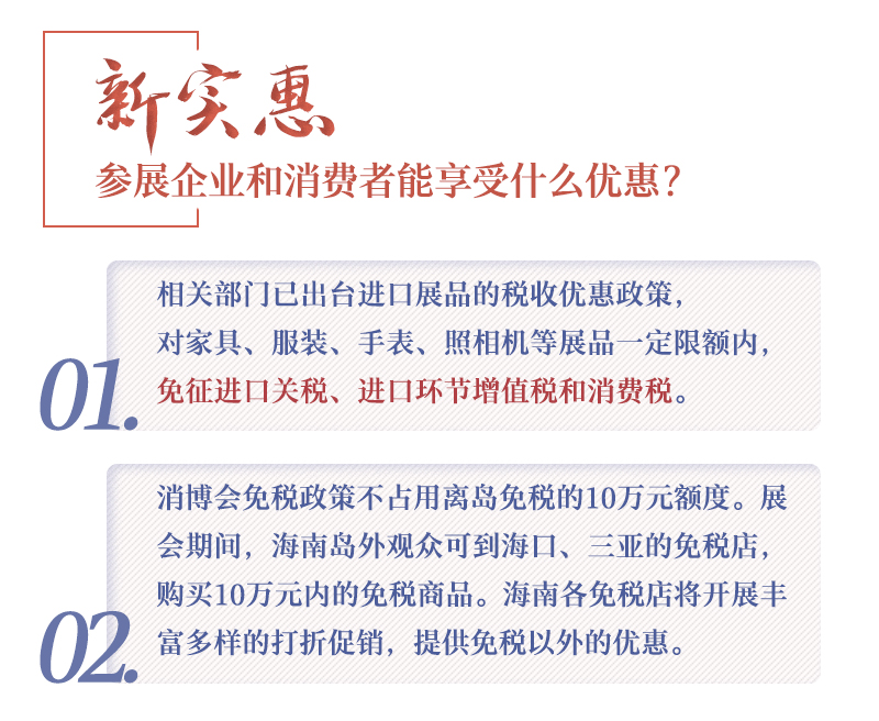 ??? 除了空前的展覽規(guī)模,本屆消博會(huì)還為參展企業(yè)和消費(fèi)者提供稅收優(yōu)惠政策:家具、服裝、手表、照相機(jī)等展品一定限額內(nèi),免征進(jìn)口關(guān)稅、進(jìn)口環(huán)節(jié)增值稅和消費(fèi)稅,并且消博會(huì)提供的免稅政策不占用離島免稅的10萬(wàn)元額度。