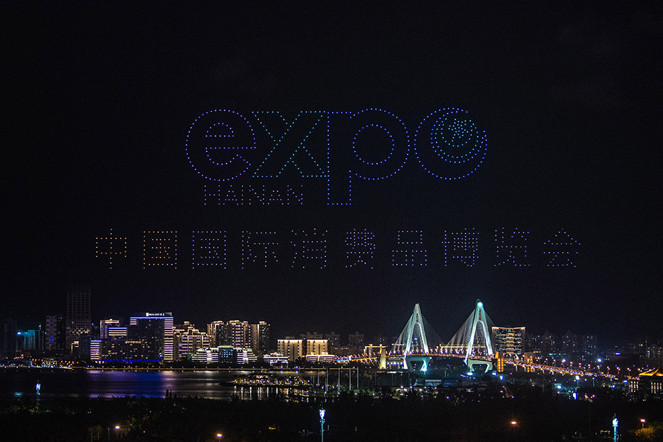 ??? 首屆中國(guó)國(guó)際消費(fèi)品博覽會(huì)于5月7日至10日在位于海口的海南國(guó)際會(huì)展中心舉辦。5月6日晚,海口市上演無(wú)人機(jī)表演秀,迎接首屆消博會(huì)的舉辦。新華社記者 蒲曉旭 攝
