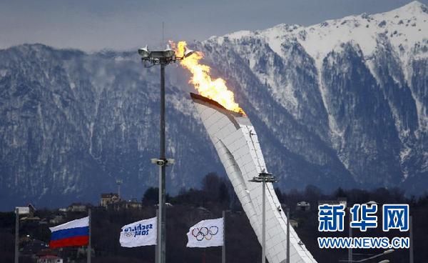 ??? 1月27日,2014年索契冬奧會主火炬塔進行了試燃,圣火在高加索山下熊熊燃燒。