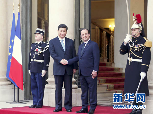 ????新華網巴黎3月26日電(記者陳贄 錢彤 劉華)國家主席習近平26日在巴黎同法國總統奧朗德舉行會談。兩國元首回顧中法建交50年的成就經驗,規劃未來兩國關系發展,達成重要共識,決定站在新的歷史起點上,開創緊密持久的中法全面戰略伙伴關系新時代。習近平強調,只要中法攜起手來,必將能夠在當前復雜多變的國際形勢下成就一番大事業,開創新的光明前景。